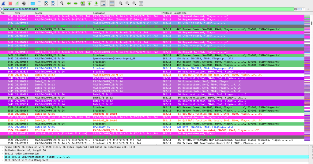 or looking for a special type of frame, in this case I would look for deauthentication frames using wlan.fc.type_subtype == 12