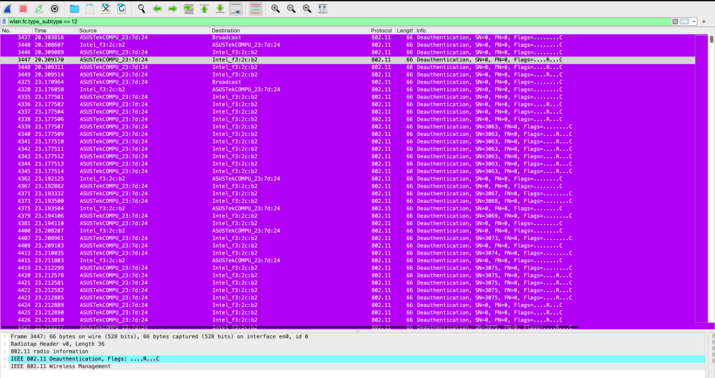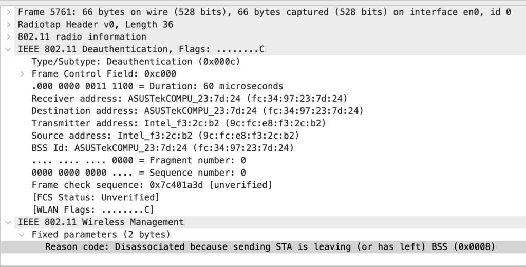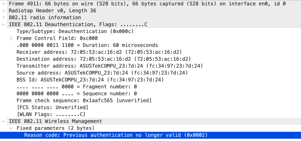 What you should look for in the Deauthentication frame is the reason code, here is three examples: ‘