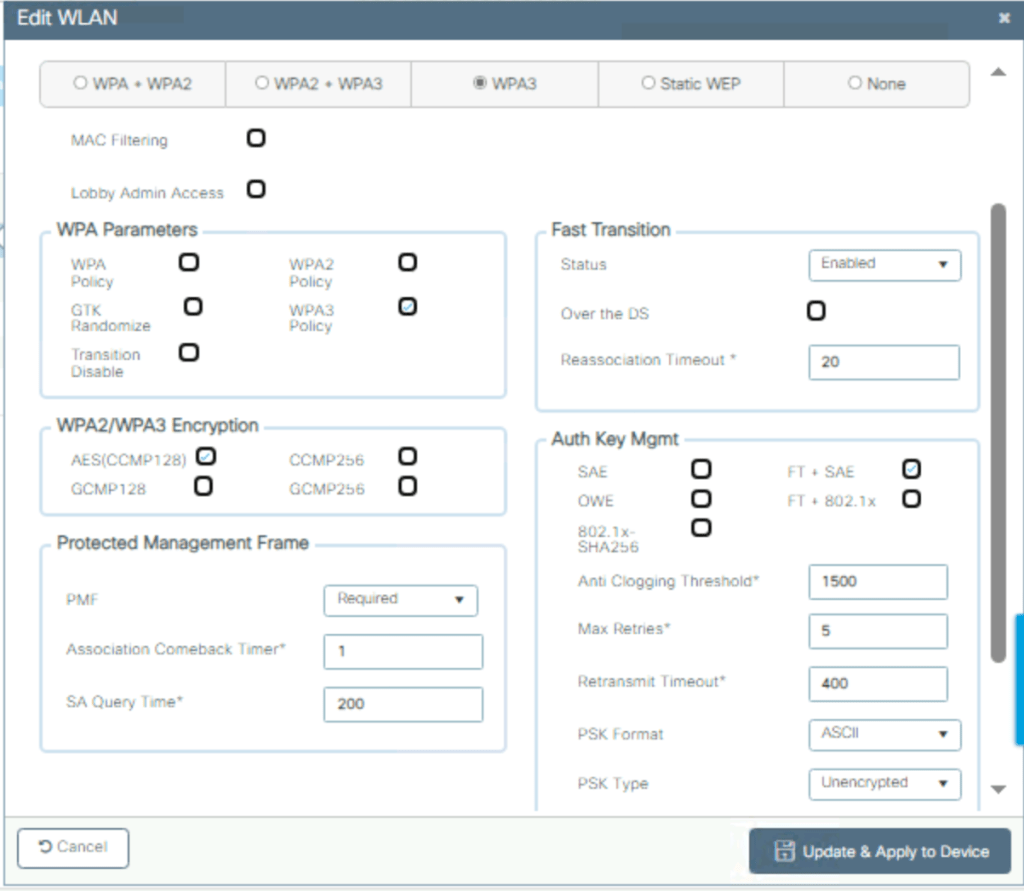 Choosing something else then “Required” under Protected Management Frame will give an error warning since PMF is required in WPA3. Remember that if u want to configure an SSID with WPA3-SAE Transition mode and get the possibility to support WPA2-Personal and WPA3-SAE on the same SSID, this should be done under WPA2+WPA3 tab. In this case I will try a 6 GHz only SSID with Fast Transition Enabled.